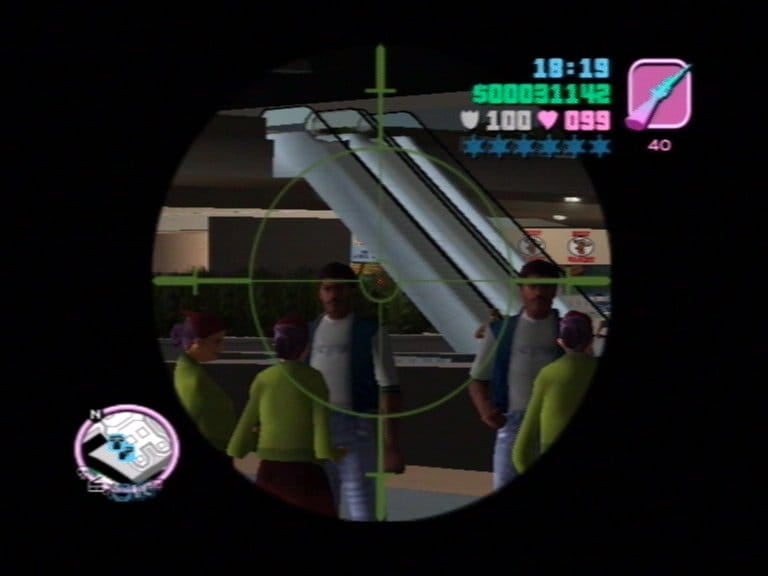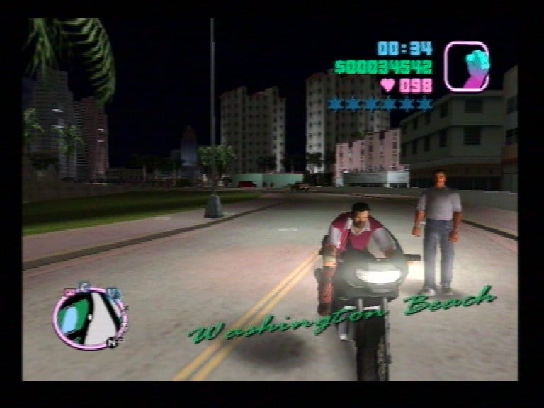 Vice City’s charm sneaks up on you in little moments. You pull a wheelie along Washington Beach at sunset and hear a radio ad for a ridiculous product you almost want to buy. You crash a moped outside the mall and run inside to change out of a blood-stained Hawaiian shirt, then walk out feeling brand new. A boat ride at night becomes a paused screenshot because the skyline catches you off guard. None of this is big tech. It’s timing, writing, and color.